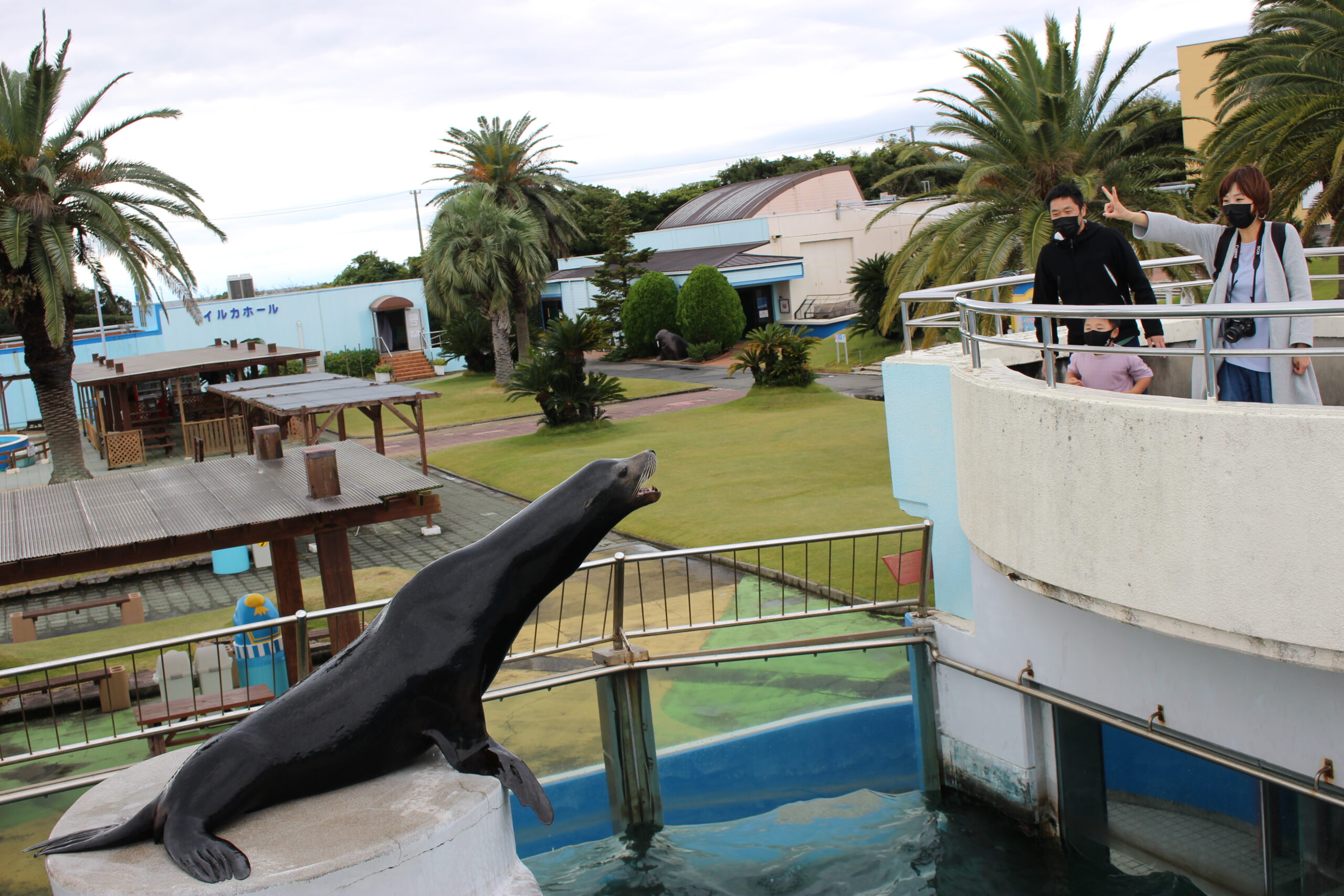 オスのカリフォルニアアシカ『ナイト』に2種類のサインを出して、エサをあげることができます。