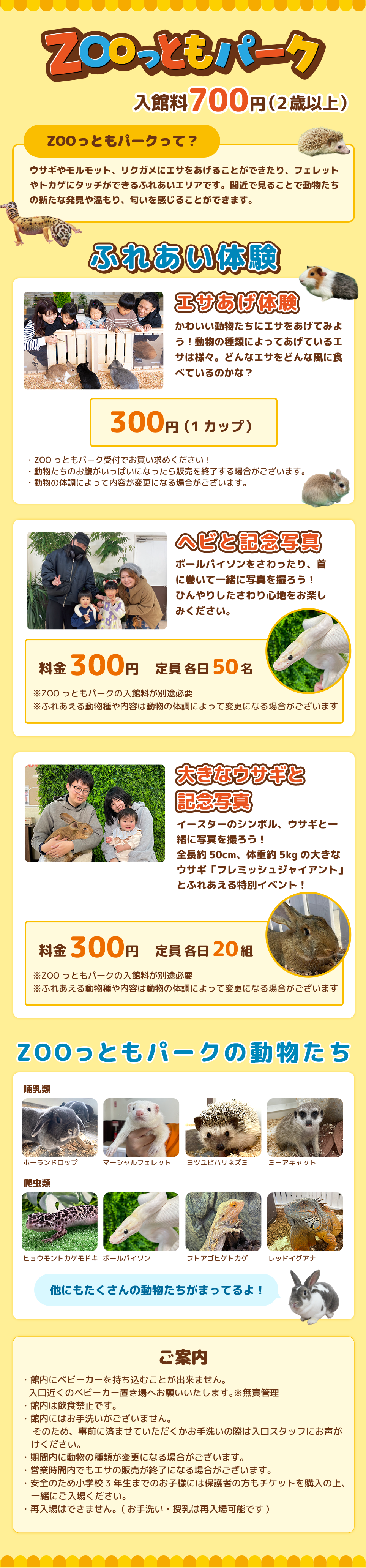 EVENTイベント ZOOっともパーク ★開催場所★ ZOOっともパーク 料金 入館料:700円(2歳以上) ヘビと記念写真参加料:300円 ※入園料別途必要 お得なセット券 入園&ZOOっともパーク入館券セット購入はこちら イベントカレンダーを見る OTHER NEW! 春のイベント … NEW! 【観覧チケット販売中】4/29開園記念日 さかなクントークショー 南知多ビーチランド開園記念日、4月29日(水・祝)にさかなクンをゲストに迎え、生… NEW! アシカ・イルカショー 3/14~6/28は春の特別ショー「SPLAP」を開催! “SPLAP”は… NEW! シルバニアファミリーわくわくフェスタ 2026 … イチオシふれあい ふれあいカーニバル 距離感ゼロ!毎日開催のふれあいカーニバルでは イルカやアザラシ、ウミガメな… スタッフおすすめ ZOOっともパーク ★開催場所★ … NEW! 【おもちゃ王国20周年記念】パビリオンリニューアル … スタッフおすすめ おもちゃ王国に新コンテンツが登場! おもちゃ王国で人気の「宝石探し」に加えて、この春から新コンテンツ「トレジャーハン… 期間限定 乗り放題券が今だけお得! おもちゃ王国のアトラクションと観覧車で使える! 乗り放題券が通常2,200… スタッフおすすめ 距離感ゼロ特別シート イルカショーをより近くで見ることができる前3列のオレンジシートエリアは期間限定で… スタッフおすすめ イルカにエサをあげよう イルカにエサを3匹あげて、ふれあうことができます! … スタッフおすすめ アシカにエサをあげよう オスのカリフォルニアアシカ『ナイト』に2種類のサインを出して、エサをあげることが… スタッフおすすめ 水族館裏側ウォッチング 普段見ることのできない水族館の裏側を飼育員がご案内します。 飼育員の話を聞… Coming Soon… ペンギンにタッチ&記念写真 フンボルトペンギンの背中にタッチ! どんなさわり心地かな?? … NEW! 海洋館リニューアル『Let’s Dive!!』 … スタッフおすすめ 入園WEBチケット 事前購入でスムーズに入園が出来るWEBチケットがおすすめ★ 特にお客さまの… スタッフおすすめ 年間パスポート 南知多ビーチランド&南知多おもちゃ王国の年間パスポートは ・カード式 … NEW! 海の生きものサポーター 「南知多ビーチランド 海の生きものサポーター」は1980年の開園以来、南知多ビー… NEW! 飼育実習の受け入れについて 当園では、以下の条件に基づき飼育実習の受け入れを行っております。 &nbs… イベントページへ