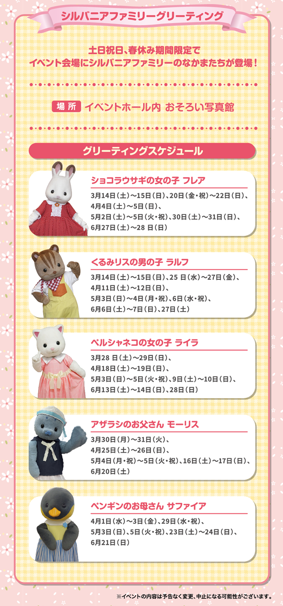 EVENTイベント シルバニアファミリーわくわくフェスタ 2026 シルバニアファミリーわくわくフェスタ 2026 イベントカレンダーを見る OTHER NEW! 春のイベント … NEW! 【観覧チケット販売中】4/29開園記念日 さかなクントークショー 南知多ビーチランド開園記念日、4月29日(水・祝)にさかなクンをゲストに迎え、生… NEW! アシカ・イルカショー 3/14~6/28は春の特別ショー「SPLAP」を開催! “SPLAP”は… NEW! シルバニアファミリーわくわくフェスタ 2026 … イチオシふれあい ふれあいカーニバル 距離感ゼロ!毎日開催のふれあいカーニバルでは イルカやアザラシ、ウミガメな… スタッフおすすめ ZOOっともパーク ★開催場所★ … NEW! 【おもちゃ王国20周年記念】パビリオンリニューアル … スタッフおすすめ おもちゃ王国に新コンテンツが登場! おもちゃ王国で人気の「宝石探し」に加えて、この春から新コンテンツ「トレジャーハン… 期間限定 乗り放題券が今だけお得! おもちゃ王国のアトラクションと観覧車で使える! 乗り放題券が通常2,200… スタッフおすすめ 距離感ゼロ特別シート イルカショーをより近くで見ることができる前3列のオレンジシートエリアは期間限定で… スタッフおすすめ イルカにエサをあげよう イルカにエサを3匹あげて、ふれあうことができます! … スタッフおすすめ アシカにエサをあげよう オスのカリフォルニアアシカ『ナイト』に2種類のサインを出して、エサをあげることが… スタッフおすすめ 水族館裏側ウォッチング 普段見ることのできない水族館の裏側を飼育員がご案内します。 飼育員の話を聞… Coming Soon… ペンギンにタッチ&記念写真 フンボルトペンギンの背中にタッチ! どんなさわり心地かな?? … NEW! 海洋館リニューアル『Let’s Dive!!』 … スタッフおすすめ 入園WEBチケット 事前購入でスムーズに入園が出来るWEBチケットがおすすめ★ 特にお客さまの… スタッフおすすめ 年間パスポート 南知多ビーチランド&南知多おもちゃ王国の年間パスポートは ・カード式 … NEW! 海の生きものサポーター 「南知多ビーチランド 海の生きものサポーター」は1980年の開園以来、南知多ビー… NEW! 飼育実習の受け入れについて 当園では、以下の条件に基づき飼育実習の受け入れを行っております。 &nbs… イベントページへ